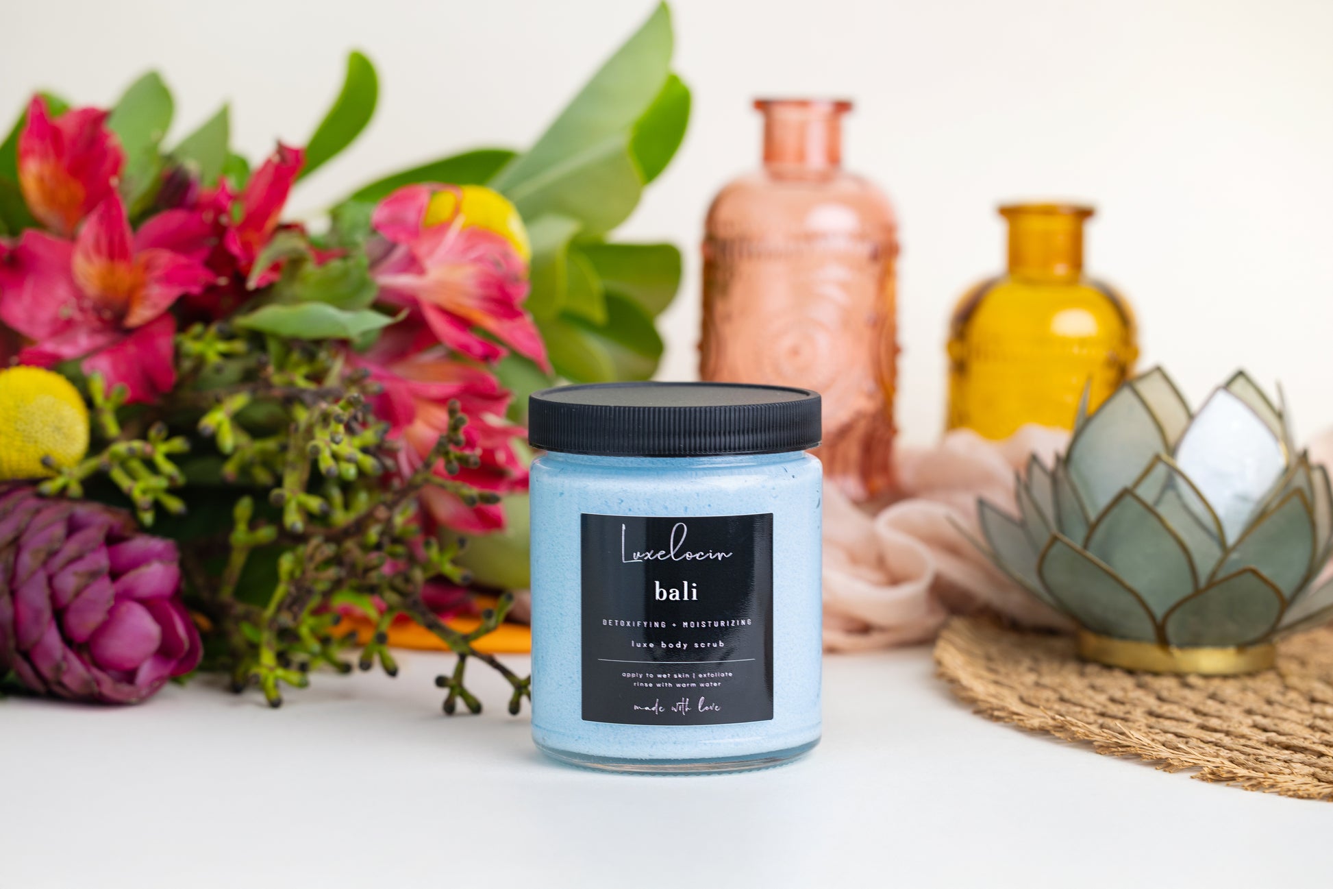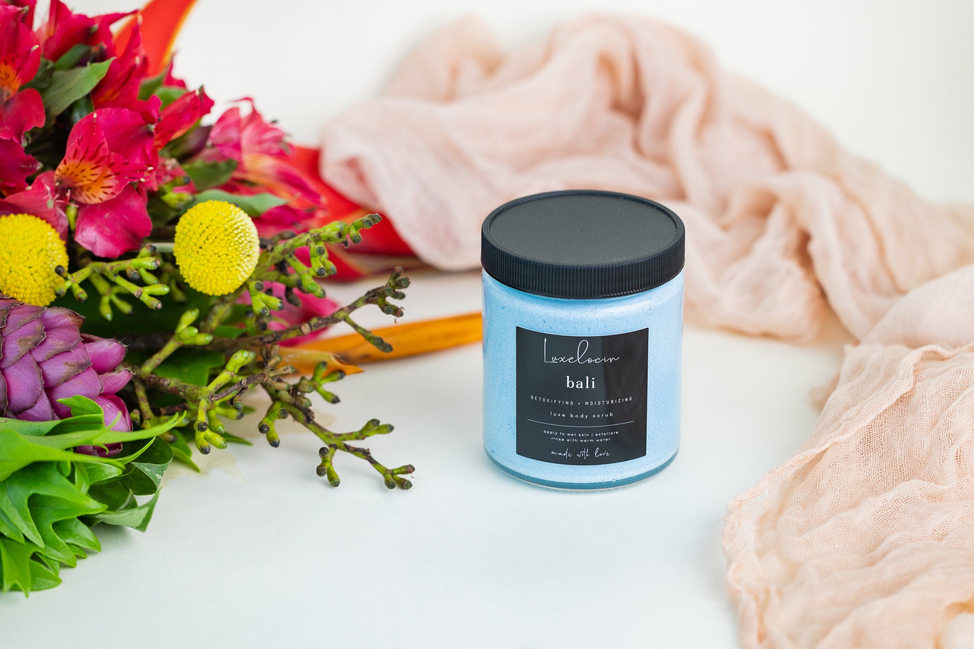 Luxelocin foaming body scrub is packaged in a eco-friendly glass jar. Net weight | 10 oz.