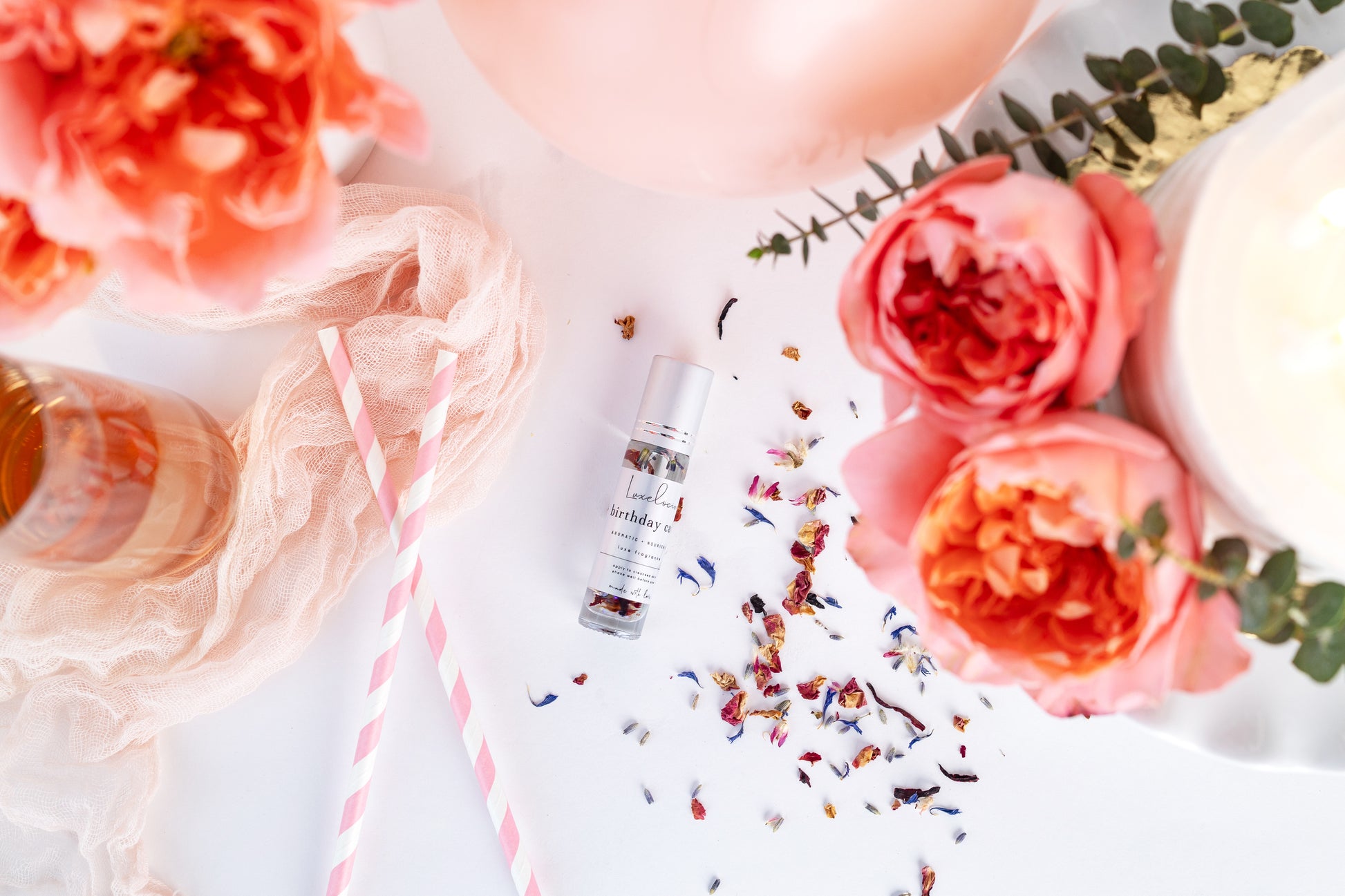 Beautifully scented glass fragrance roller bottles infused with gorgeous floral petals.