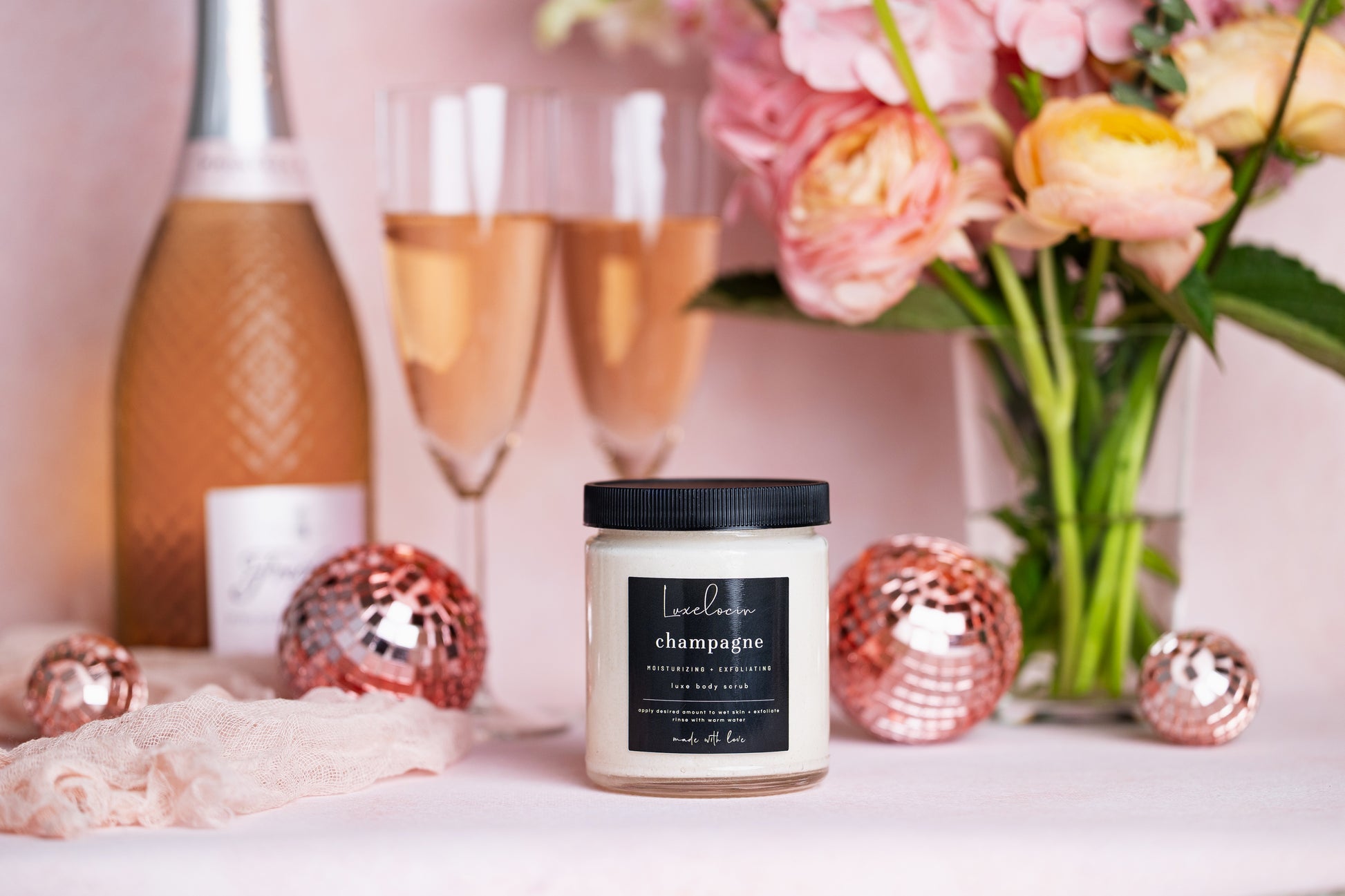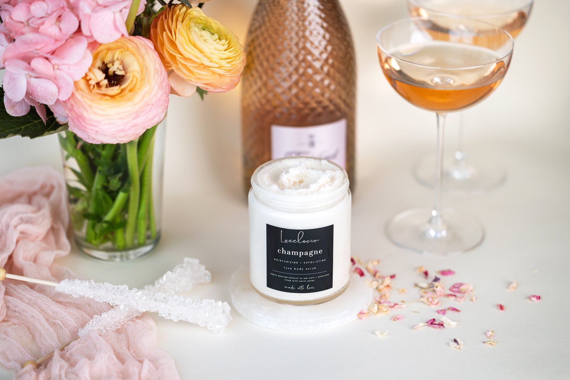 Ingredients | organic cane sugar, aloe butter, champagne extract, glycerin, fragrance oil, sorbitol, mica powder, salt, phenoxyethanol, sodium laurel isethionate, water