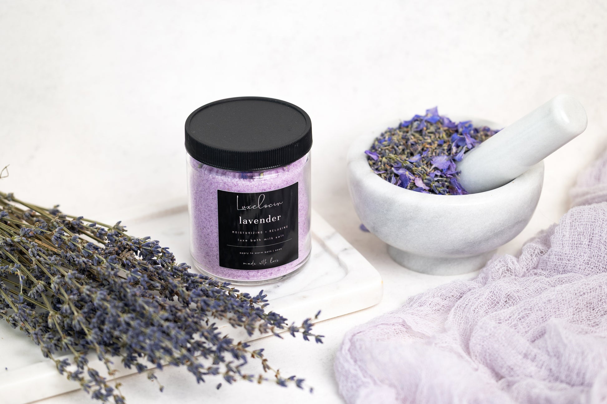 Luxelocin bath milk salt is not like your typical salt. We infuse our bath salts with coconut milk and vitamin enriched extracts to make your bath not only relaxing but providing beneficial nutrients to your skin.