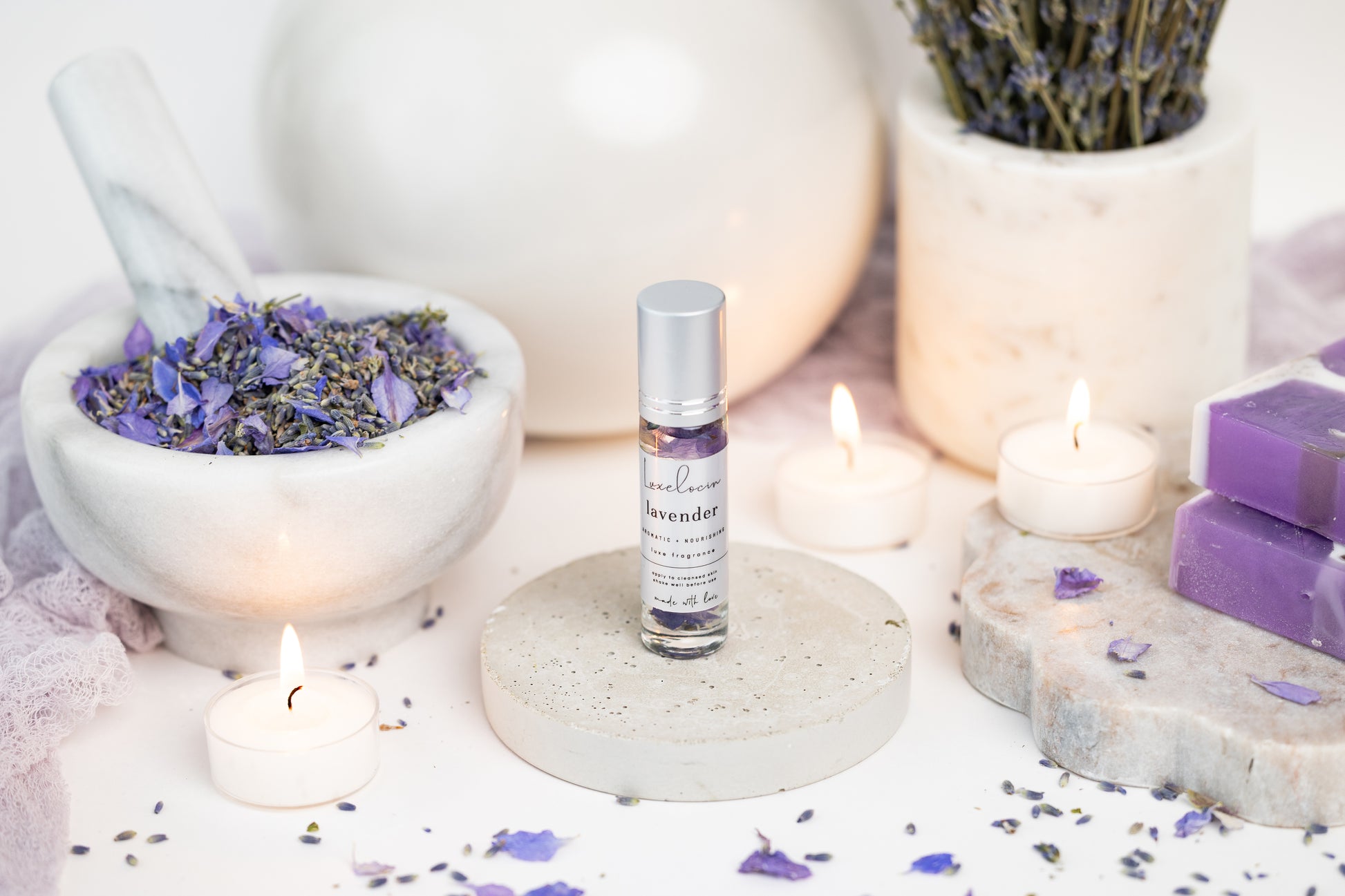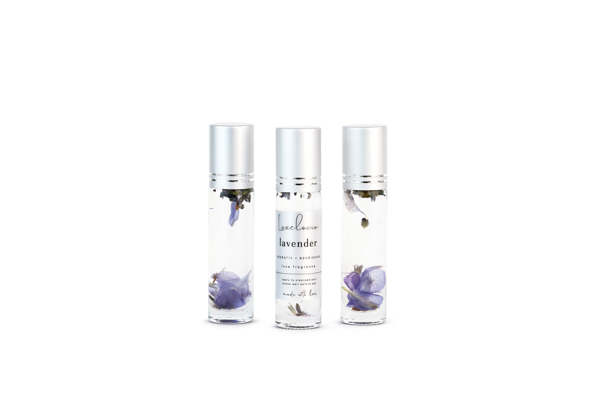 Beautifully scented glass fragrance roller bottles infused with gorgeous floral petals.