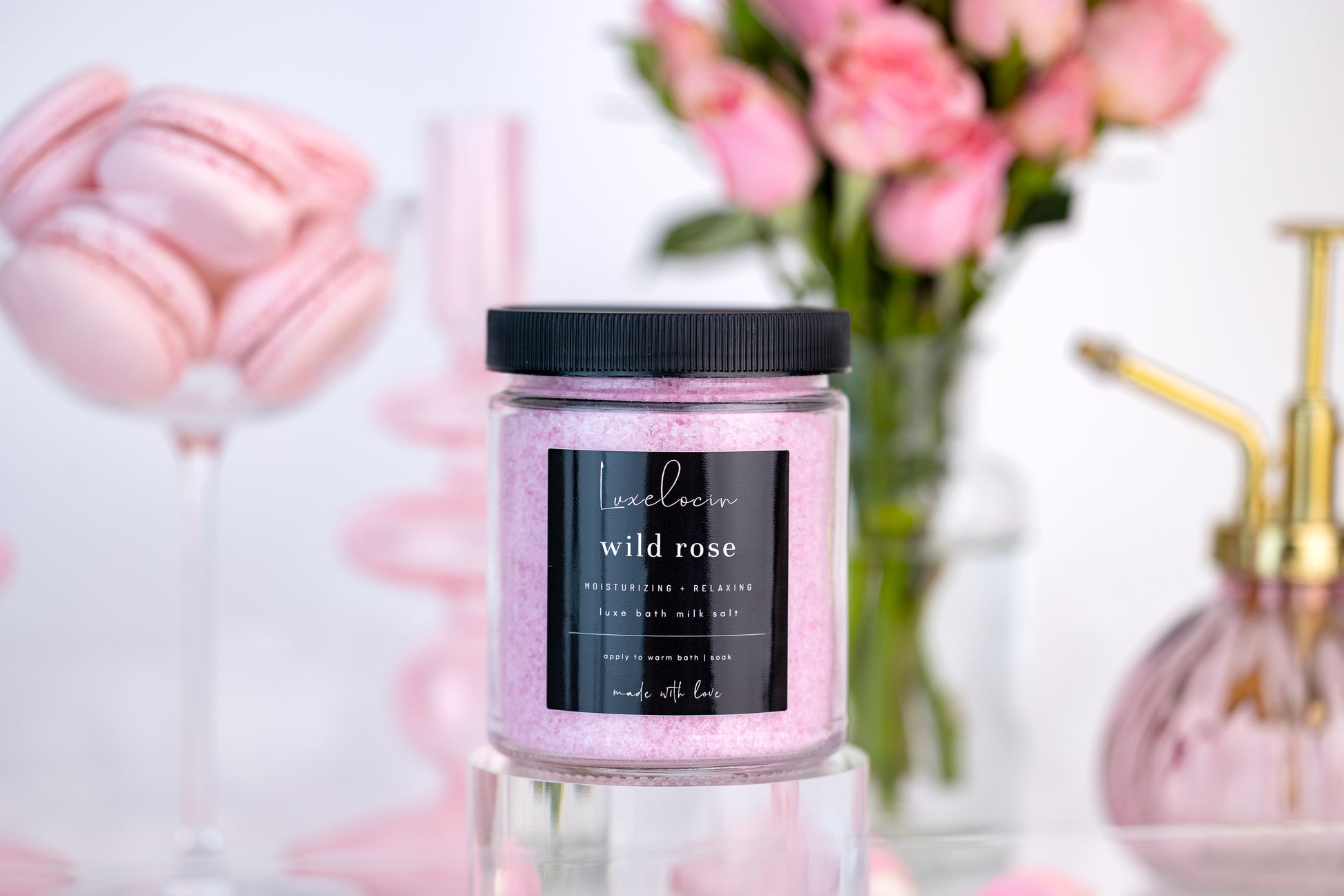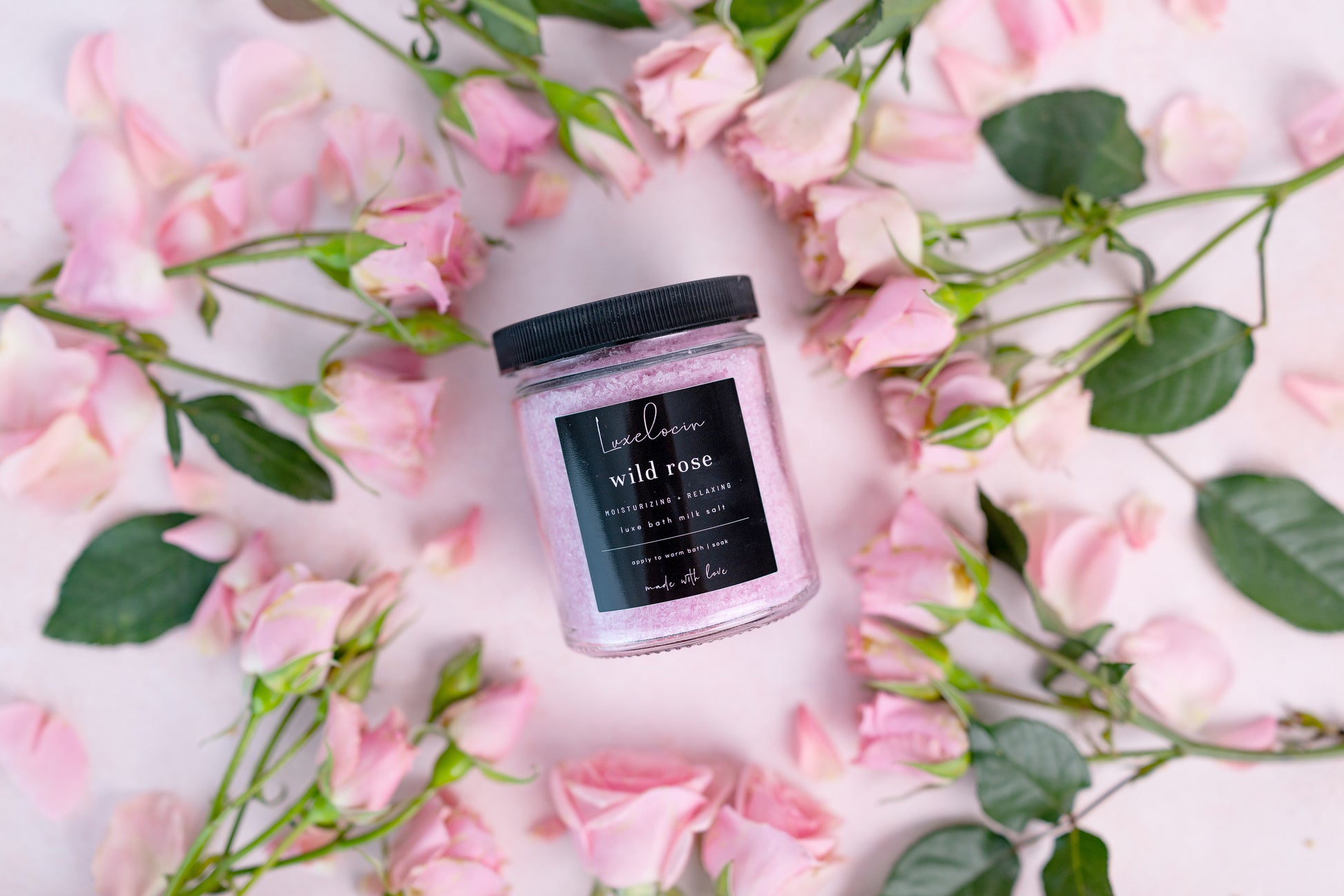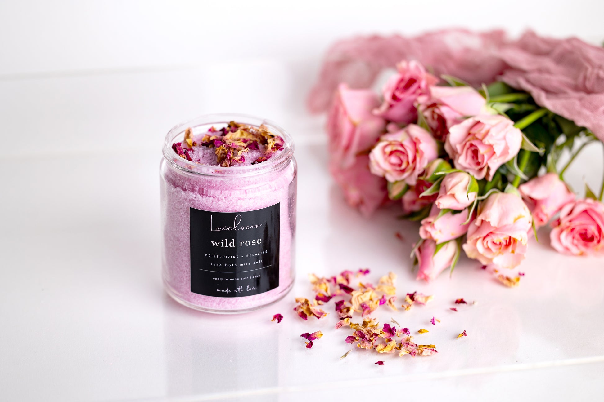 Each luxe bath salt has a different extract for a special treat. All extracts have vitamins that leave the skin feeling soft and luxurious. Wild Rose bath milk salt is infused with rose extract.