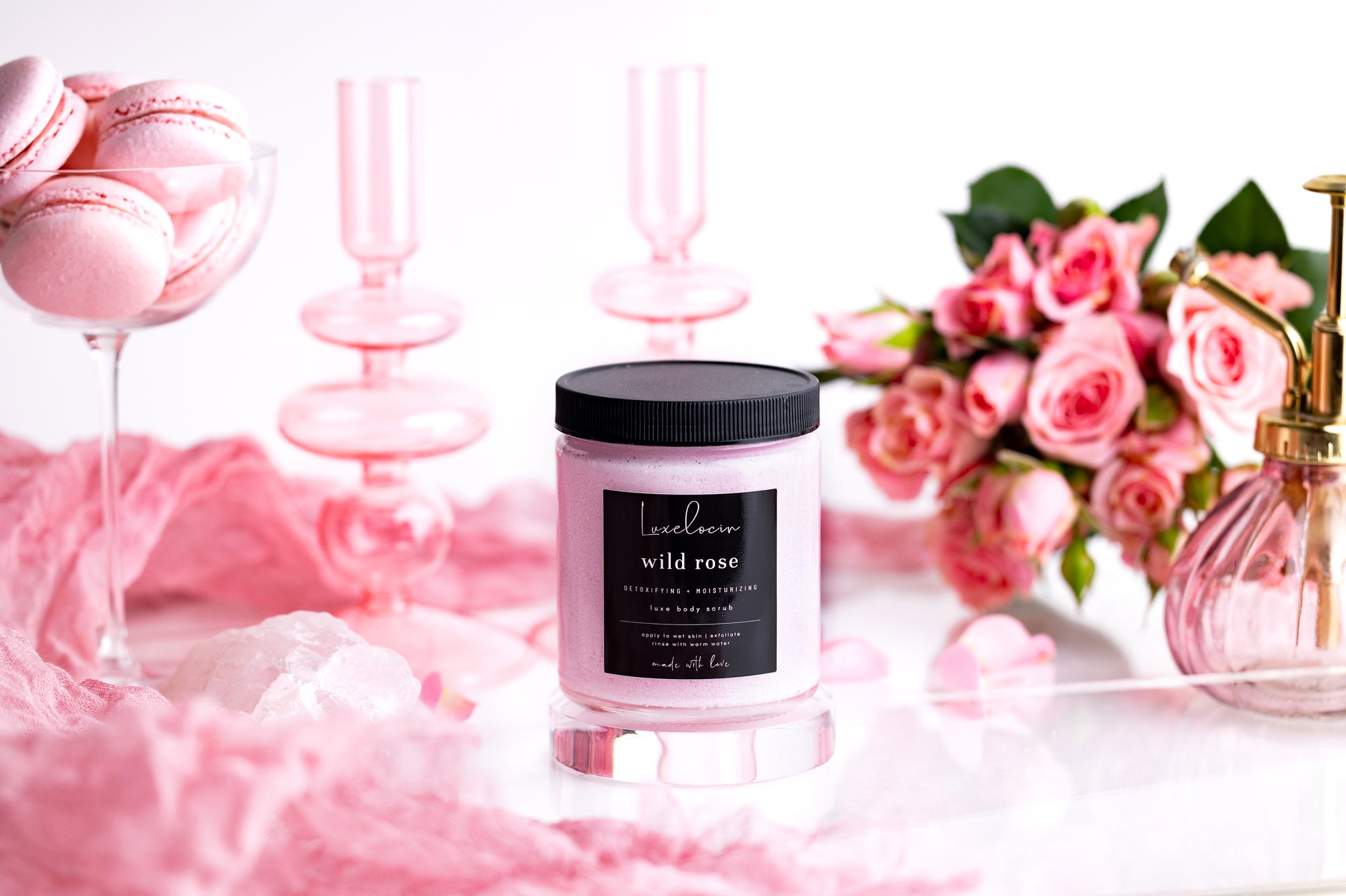 Wild Rose body scrub is infused with rose extract. Rose extract has a complex concentration of antioxidants, minerals, vitamins A, C, D, and E, and essential fatty acids. These components are well known for reducing fine lines, plumping the skin, helping to stimulate collagen production and intense hydrating properties.