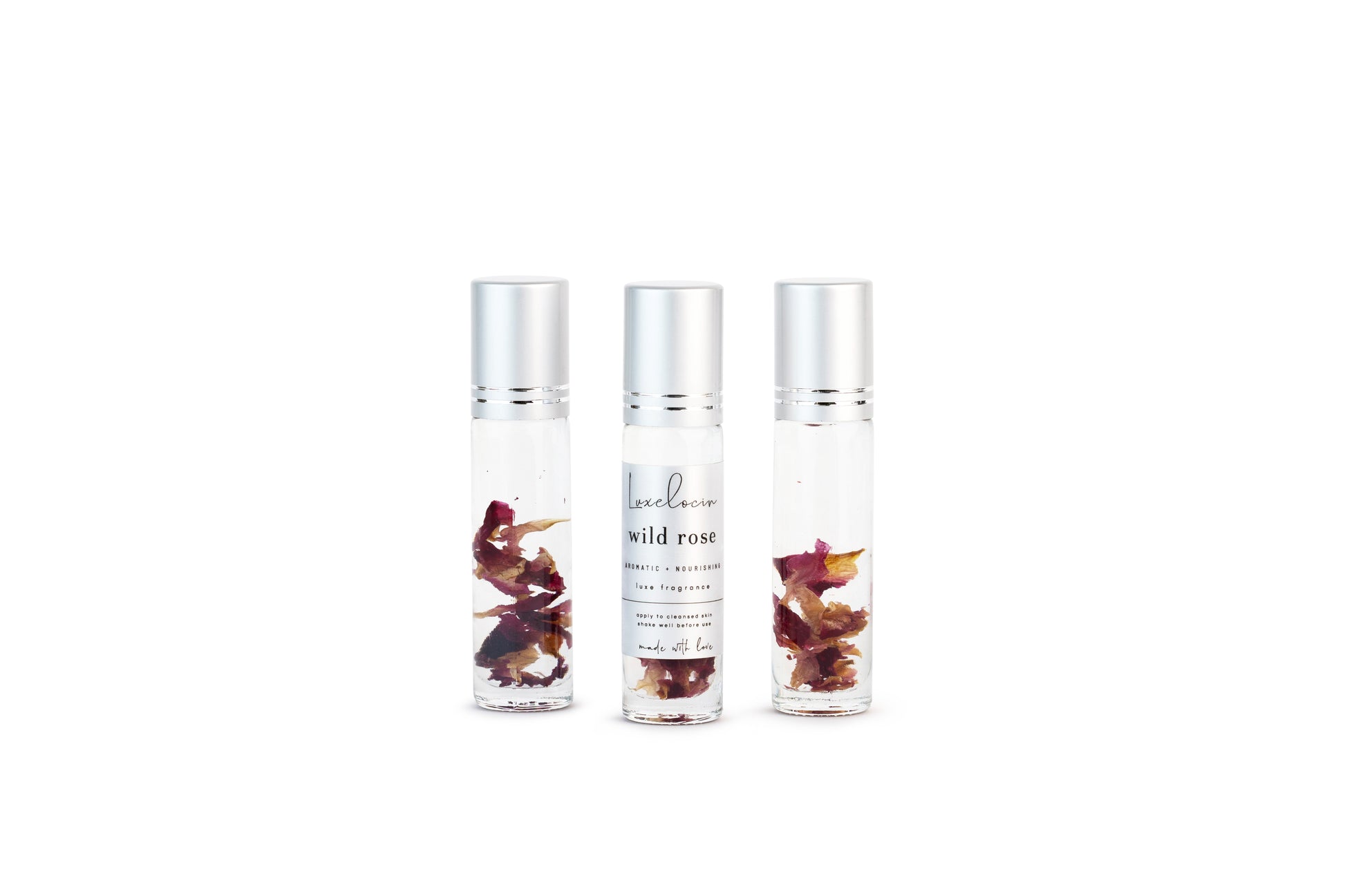 Beautifully scented glass fragrance roller bottles infused with gorgeous floral petals.